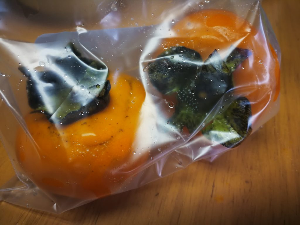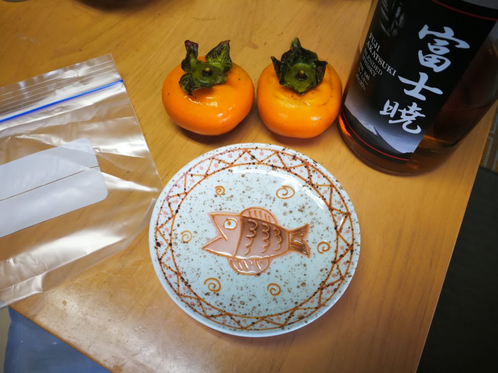 台風によって庭の柿は全て落ちてしまいましたが、畑の先の柿の木は無事でした。完熟すれば甘柿として食べられるようですが、早どりすると渋みがあるので、ウイスキーとジッパーバッグで追熟してみます。